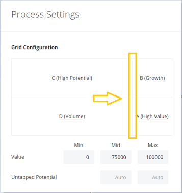 The underlying range of the Value and Untapped Potential axis will determine how the Accounts are positioned in the Growth Grid. This setting lets you decide the Min, Mid, and Max values that the Grid is to use when compressing the Accounts into their position in the Grid.