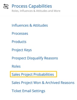 Configuring a sales project to pull probability from Custom fields is done within the Sales Process Settings, found in the top toolbar of the Process Editor