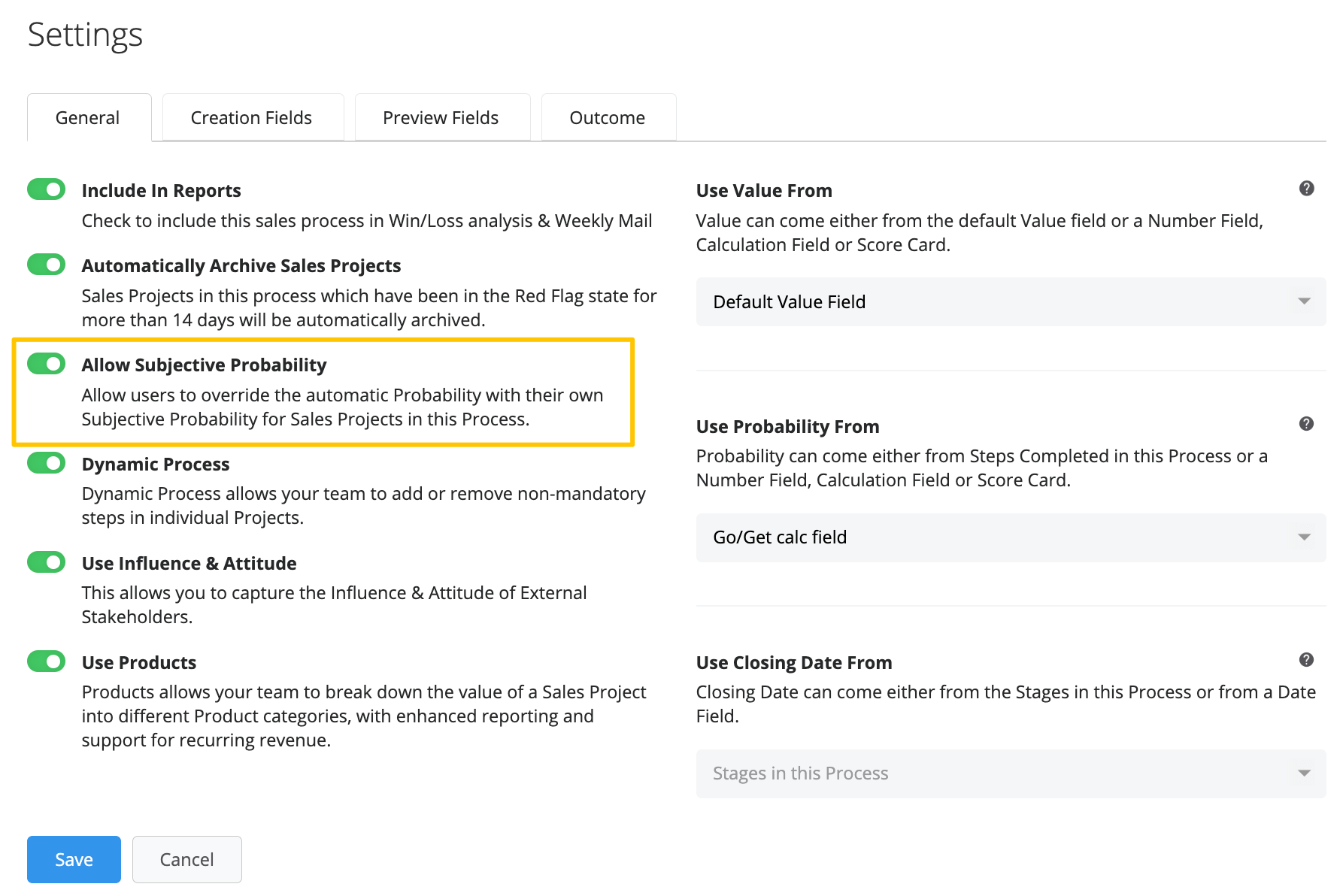 There are a number of ways you can apply probability to your process, giving you full control over how you calculate the success of opportunities.