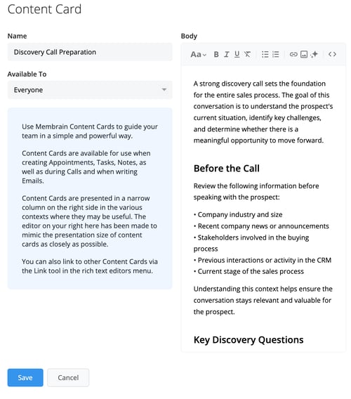Content Cards are internal guidance resources that help provide additional context, instructions, or insights directly inside Membrain. They allow administrators to add helpful information to specific areas of the system so sales teams can access the right guidance exactly when they need it.