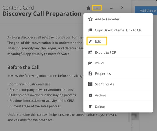 To edit a Content Card, open the card and click the three-dot menu in the top right corner, then select Edit. This allows you to modify the name, availability settings, or the content within the card.