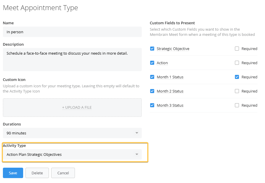 When a meeting is booked, Membrain creates an Activity using the selected Activity Type. This ensures that scheduled meetings align with your internal tracking and reporting structure. If No activity type is selected it will choose the default Meeting activity type.