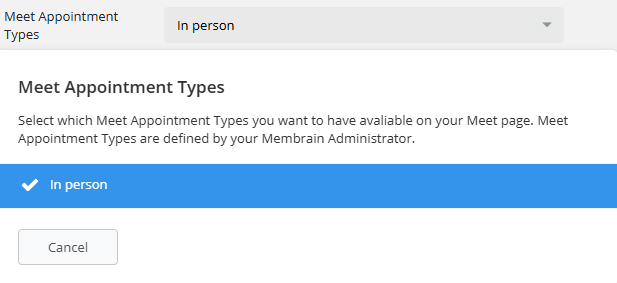Once created, Appointment Types can be made available in users’ Membrain Meet tab in My Settings.