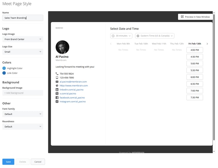 A style can be applied to one or multiple Meet Pages to ensure consistent branding across booking experiences. When a style is updated, all Meet Pages using that style are updated automatically.
