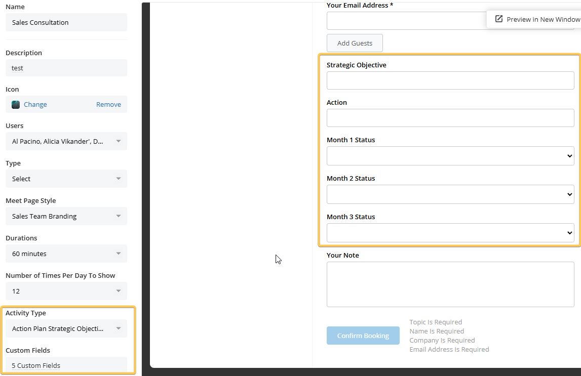 Custom Fields - Fields associated with the selected Activity Type can be displayed on the booking form. You can choose which fields appear, make them required, and adjust how they are labeled for visitors.