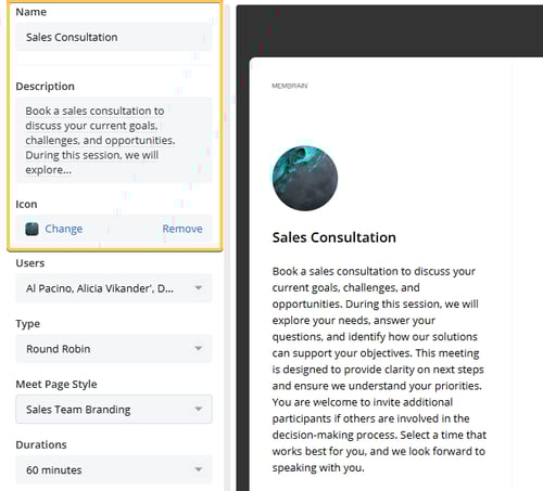 Give your Meet Page a name and optionally add a description and icon, all of which will appear on the booking page.