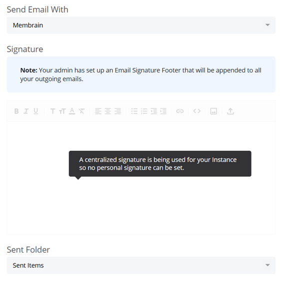 In your personal settings, it might be that you are not able to create your own signature. That is the case when a centralized email signature has been configured and applied to you, by your admins. If you're an admin and want to learn more about this feature, click here and scroll down to the "Centralized Email Signature" headline.