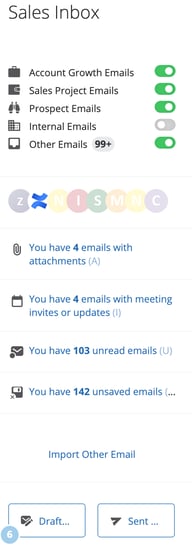 Everything else that arrives into your inbox is filtered down the list and appears in the Other email section. What ends up here are emails coming from contacts that are not related to sales projects or prospects, or just plain old personal email. These less important emails will show in a neutral color.