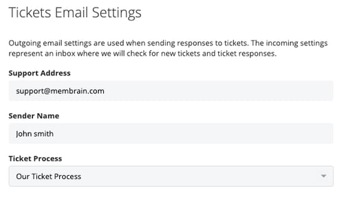 The Sender Name section allows you to establish the identity that your customers see when they receive responses to their inquiries. This name is what will appear in the sender field of outgoing ticket-related emails.