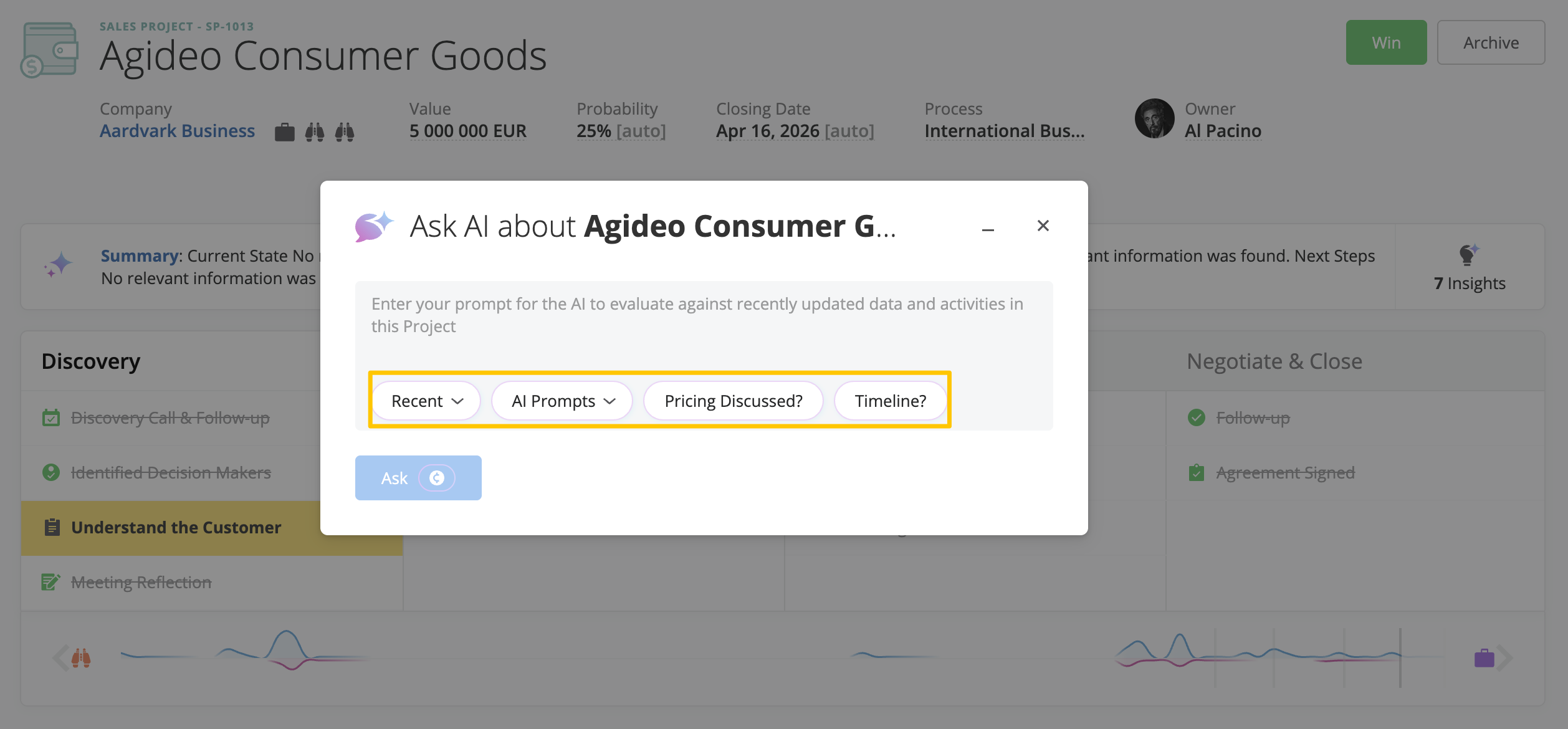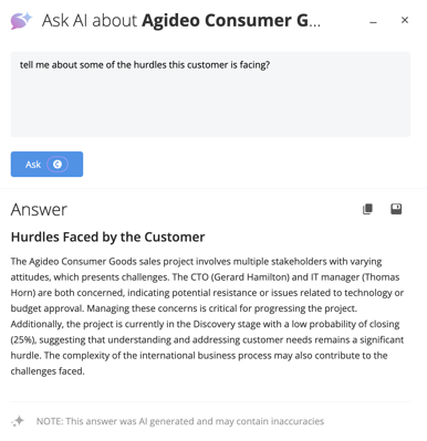 In Sales Projects, Prospects, Account Growth Projects, and Tickets, you can ask questions about recent activity, stakeholder engagement, or next steps.