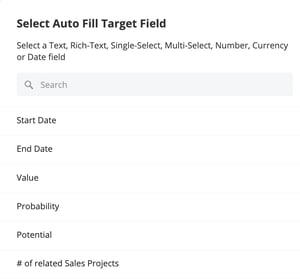 From there, select the custom field you want to automatically populate. This could be a number, currency, or date field—those are the only types currently supported for data autofill.