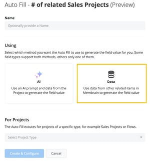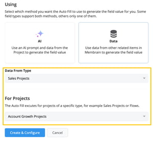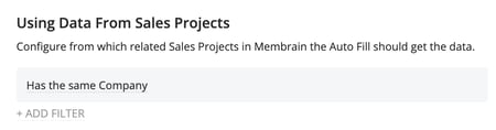 Once you've selected the field and the Data autofill type, define the data source. This tells Membrain where to look for the information. You can pull data from many parts of the platform, including Sales Projects, Account Growth Projects, Tickets, Flows, Companies, Contacts, Activities, or Documents.