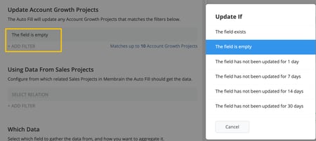 You'll now decide when the autofill should run. Membrain gives you several condition options. You can update the field only if it’s empty, or you can choose to run the automation if the field hasn’t been updated for a certain number of days. This helps prevent unnecessary updates while keeping your data fresh.