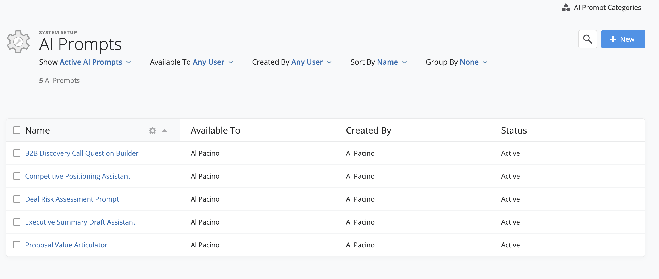 AI Prompts can be managed from System Setup. The list view shows all existing prompts in your system and provides tools for filtering, sorting, and organizing them. You can filter by availability (such as active or archived), visibility, or creator. You can also group and sort the list based on different properties.