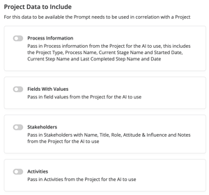 You can start by enabling Process Information, which gives the AI context like project type, process name, current stage, step names, and relevant dates. This helps the AI understand where the project sits in the sales cycle.