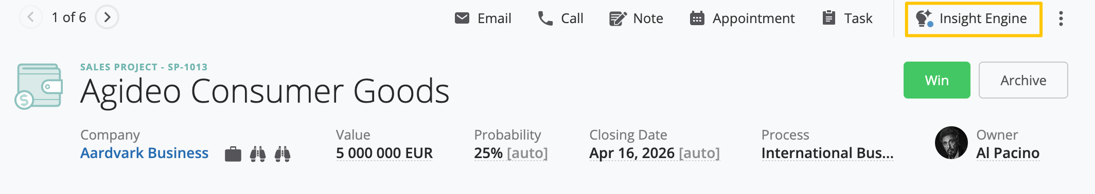 The Insight Engine automatically evaluates Project data and surfaces relevant signals to help you focus on what matters most. By combining structured CRM data with AI-generated analysis, it turns information into actionable insight inside each Project.