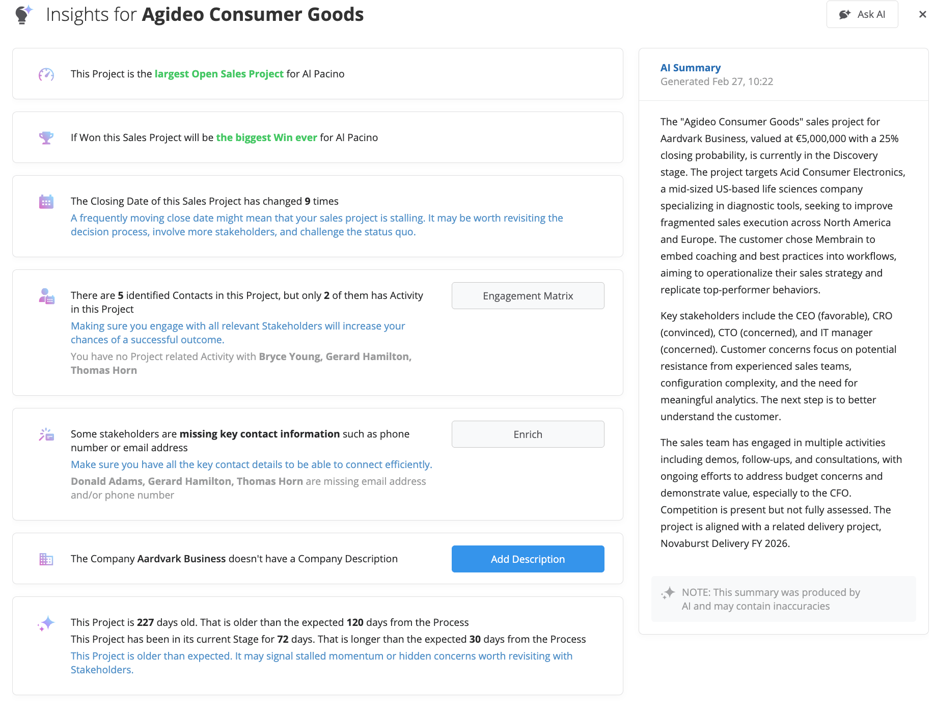 Many insights are automatically generated from the structured data in your Project, such as activities, stakeholders, and process steps.