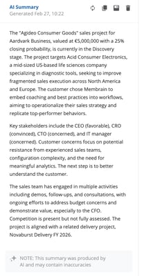 The summary is generated using the default AI Summary Prompt configured in the Insight Engine Settings and is based on Project data and activity history. You can refresh the summary if the one that populated isn't to your liking. You're also able to copy it to your clipboard, save it to the activity stream, save it to a text custom field, or delete it.