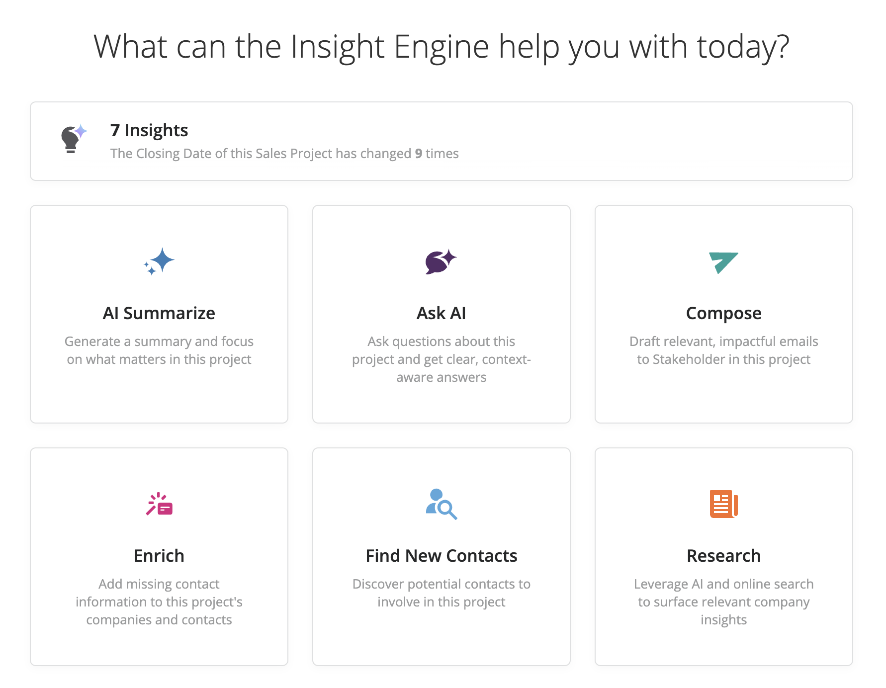 The Insight Engine helps streamline the parts of the sales process that often slow teams down. Whether you're preparing for a meeting, following up with a prospect, or updating project information, AI is available to make these steps faster and more effective.