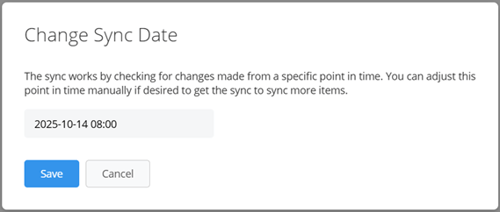 During the initial sync process, if the data set to be synced has not been modified recently, change the sync timestamps to an earlier date. To update the sync date: