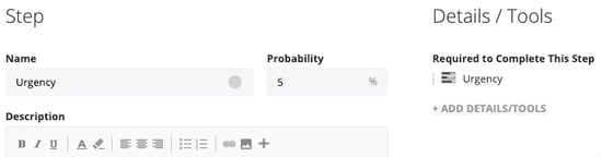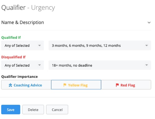 Add a Qualifier to a step by following these steps. In this example, we will add a Qualifier to the step which records the level of urgency for products or services to be delivered. We will qualify this step if the product or service is required within 12 months, and disqualify if it is 18+ months, or has no deadline identified.