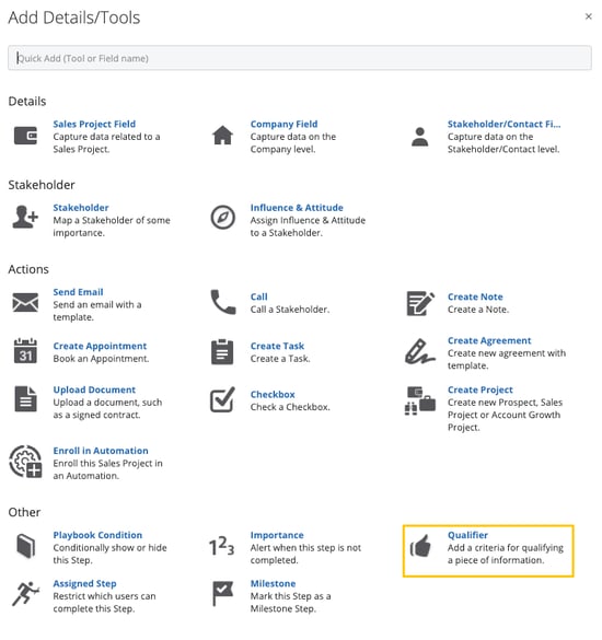 A Qualifier can be added to a step in the Process to indicate visually if the information you are gathering about the company or stakeholder is positive, negative, or somewhere in between.